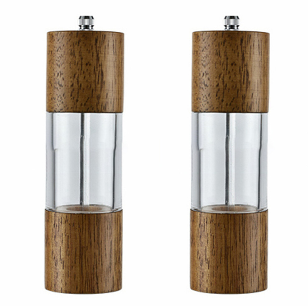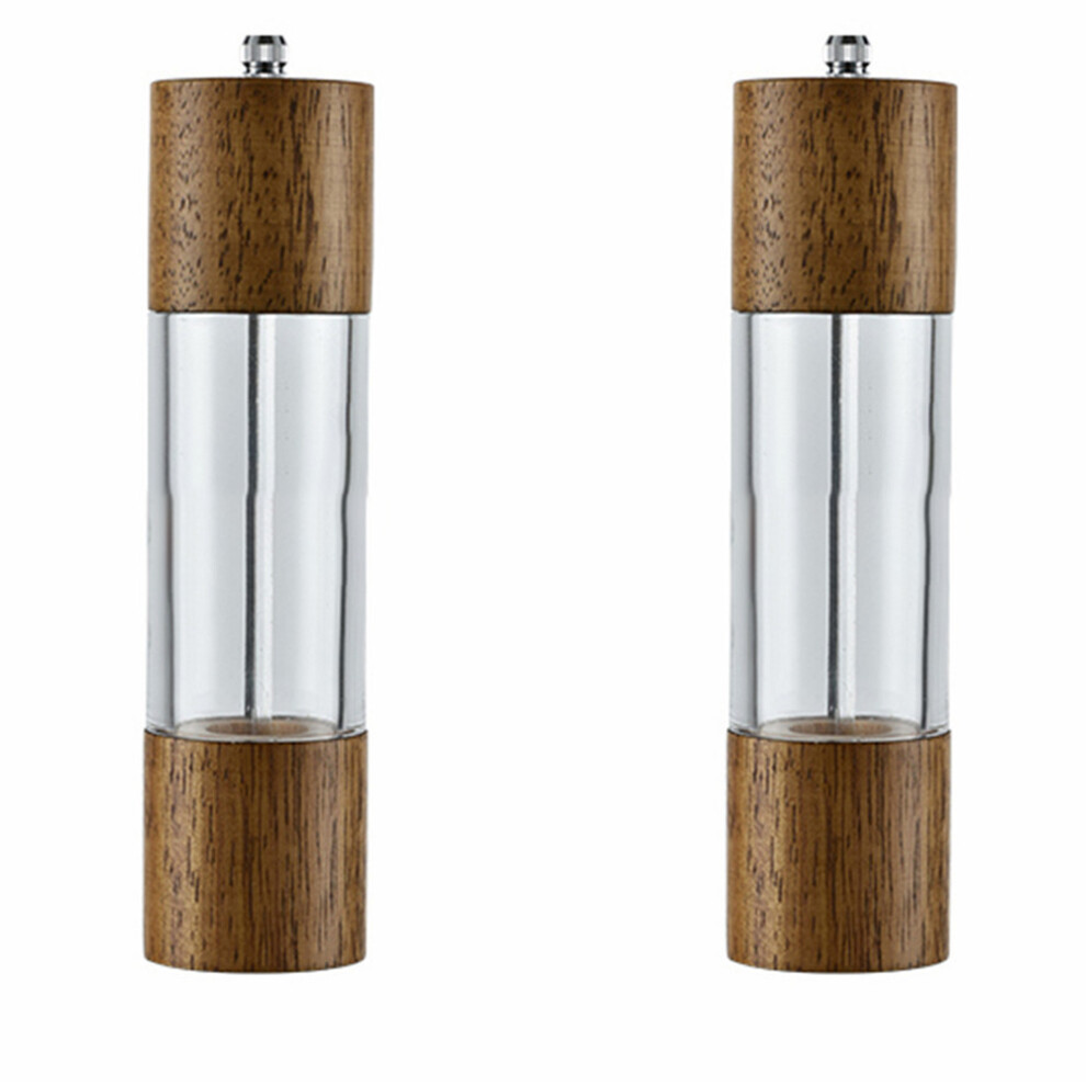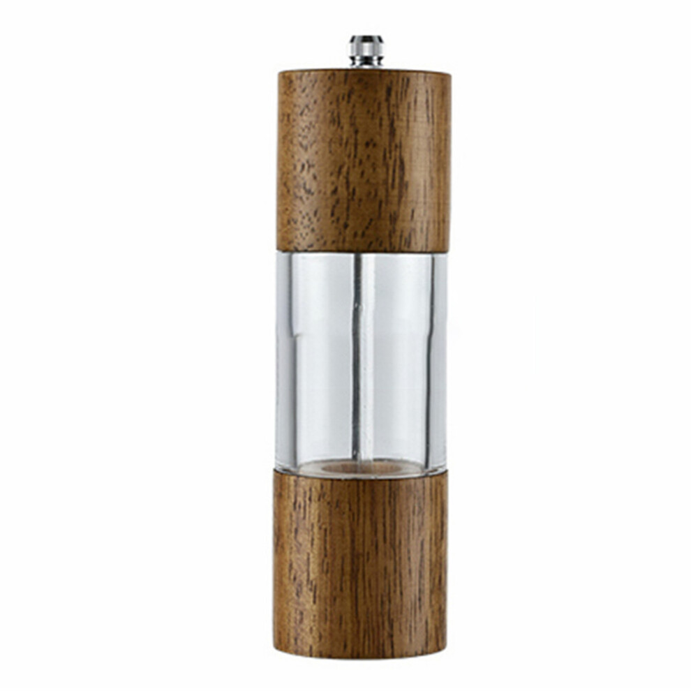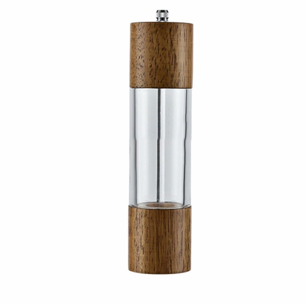 Stylish Wood Finish Salt And Pepper Grinder, Clear Acrylic Body, Adjustable Ceramic Core, Multipurpose, Elegant Kitchen Addition