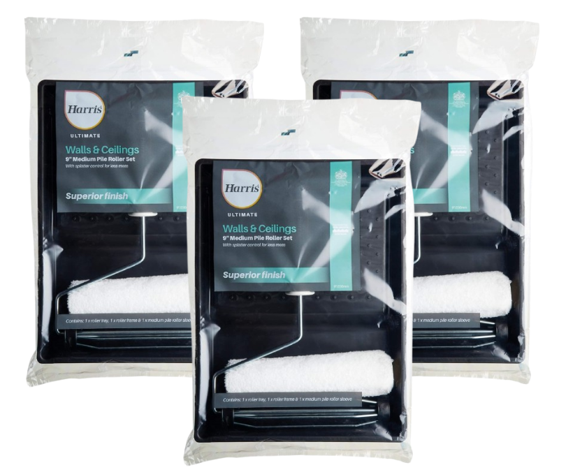 3 x Harris Premium Finish Ultimate Walls & Ceilings Roller,Frame & Tray