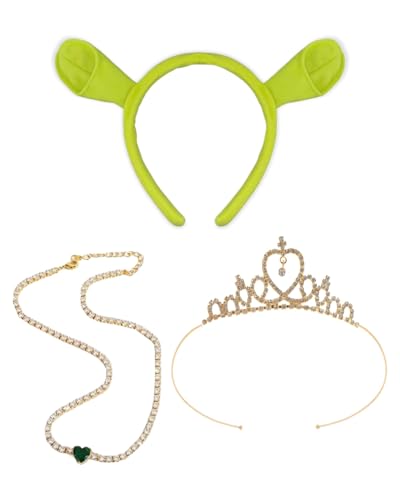 Koongso Princess Fiona Costume Accessories, Green Ogre Ears Headband with Sparkly Tiara and Green Heart Necklace, Kids Birthday Party Cosplay Props