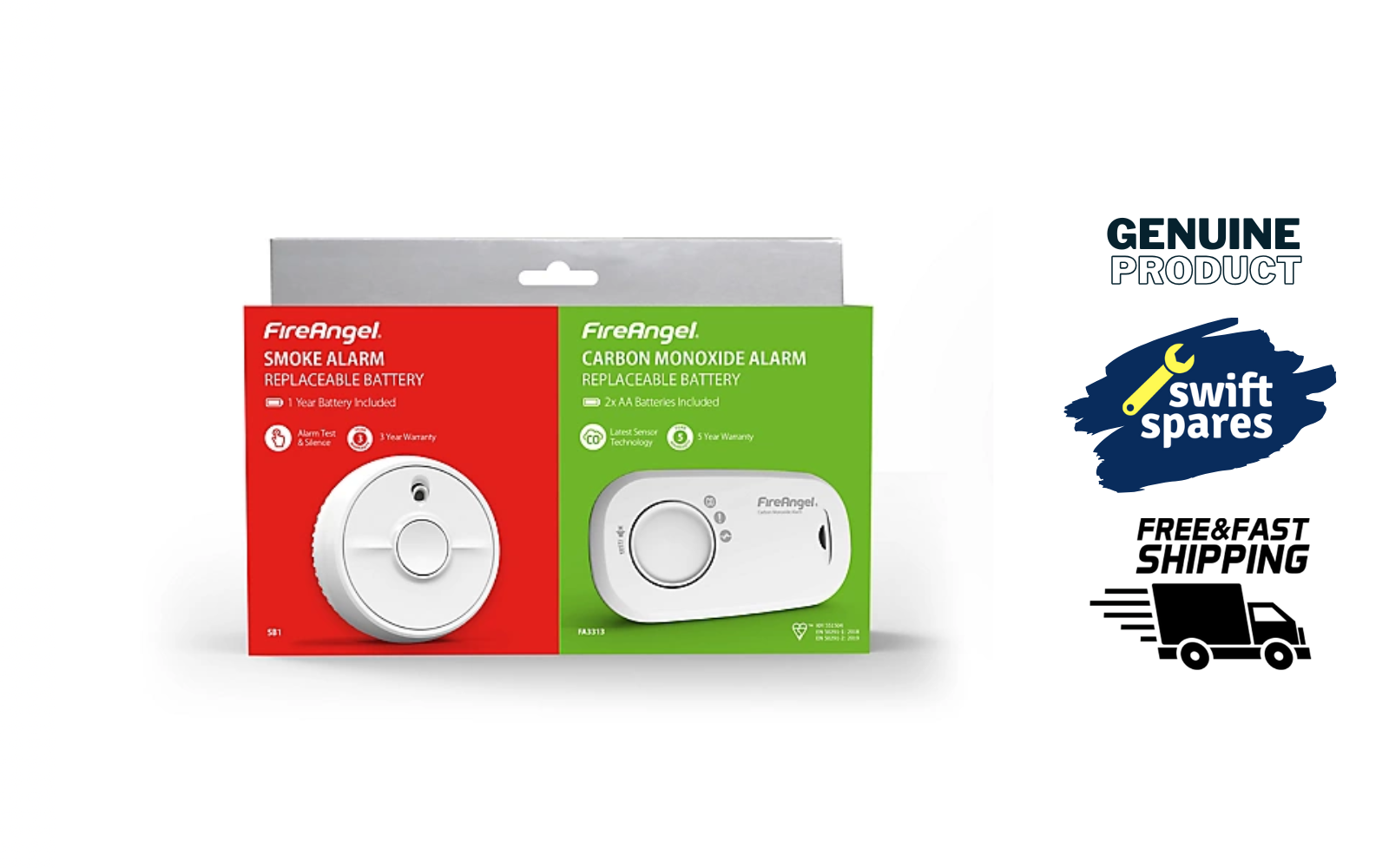 FireAngel FA6813-EUX10 FA6813 Carbon Monoxide Detector & Alarm with Replaceable Batteries & Optical Smoke Alarm with 5 Year Replaceable Batteries, FA6615-R (ST-625 replacement, new gen)