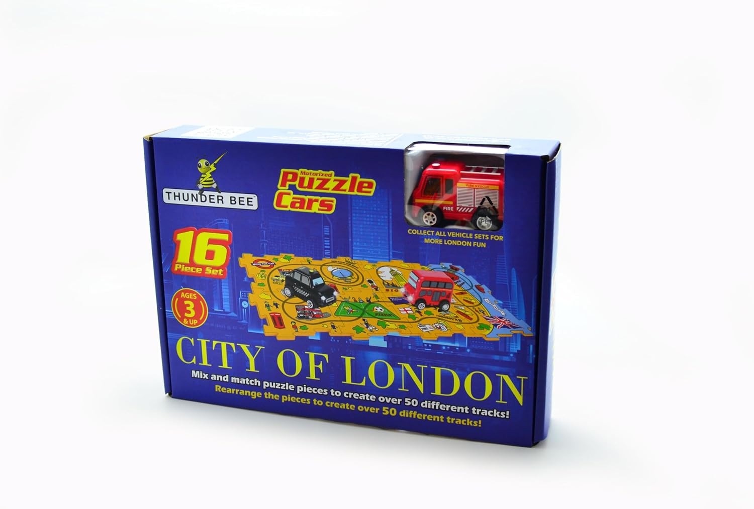 Buzz Toys Puzzle Cars City of London – 16-Piece Track Set with Fire Engine Toy, Mix & Match Puzzle Pieces for Over 50 Layouts, Educational Play for Kids Ages 3+