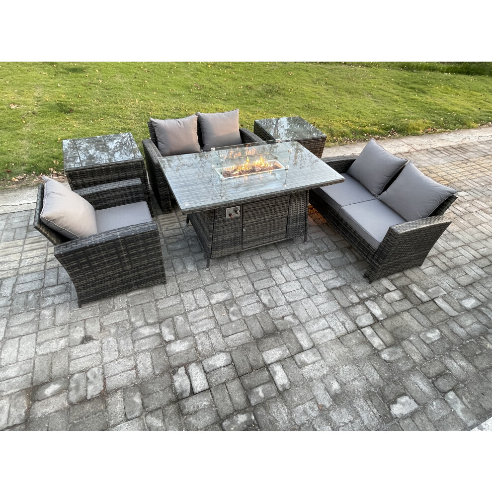 Fimous Rattan Outdoor Garden Furniture Gas Fire Pit Table Sets Gas Heater with Love Sofa Armchair Big Footstool Side Table 6 Seater Dark Mixed Grey