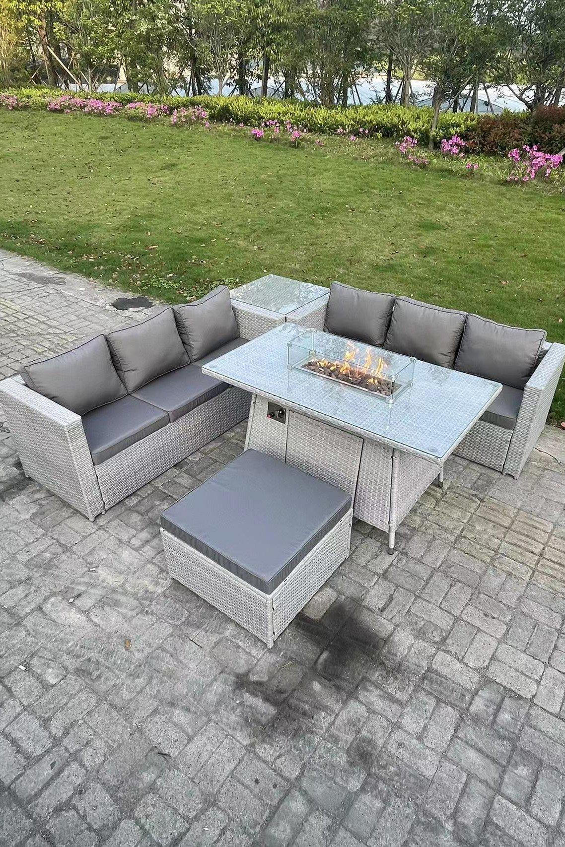 FMSGarden Outdoor Rattan Garden Furniture Sofa Set Gas Fire Pit Dining Table Gas Heater Burner With Armchair 7 Seater Dark Grey Mixed