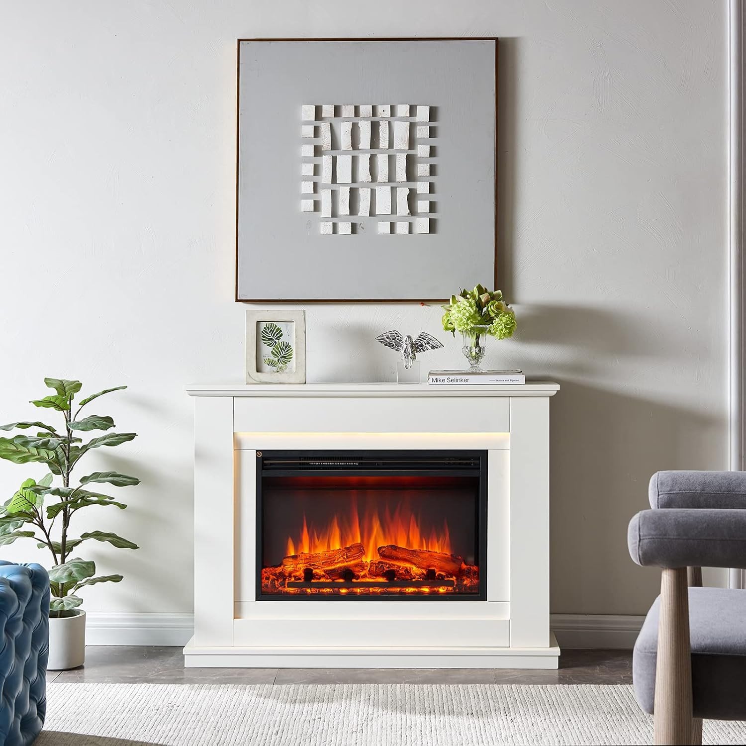 (Fire Surround White) Modern Electric Fireplace with Remote Control & LED Log Fire Effect