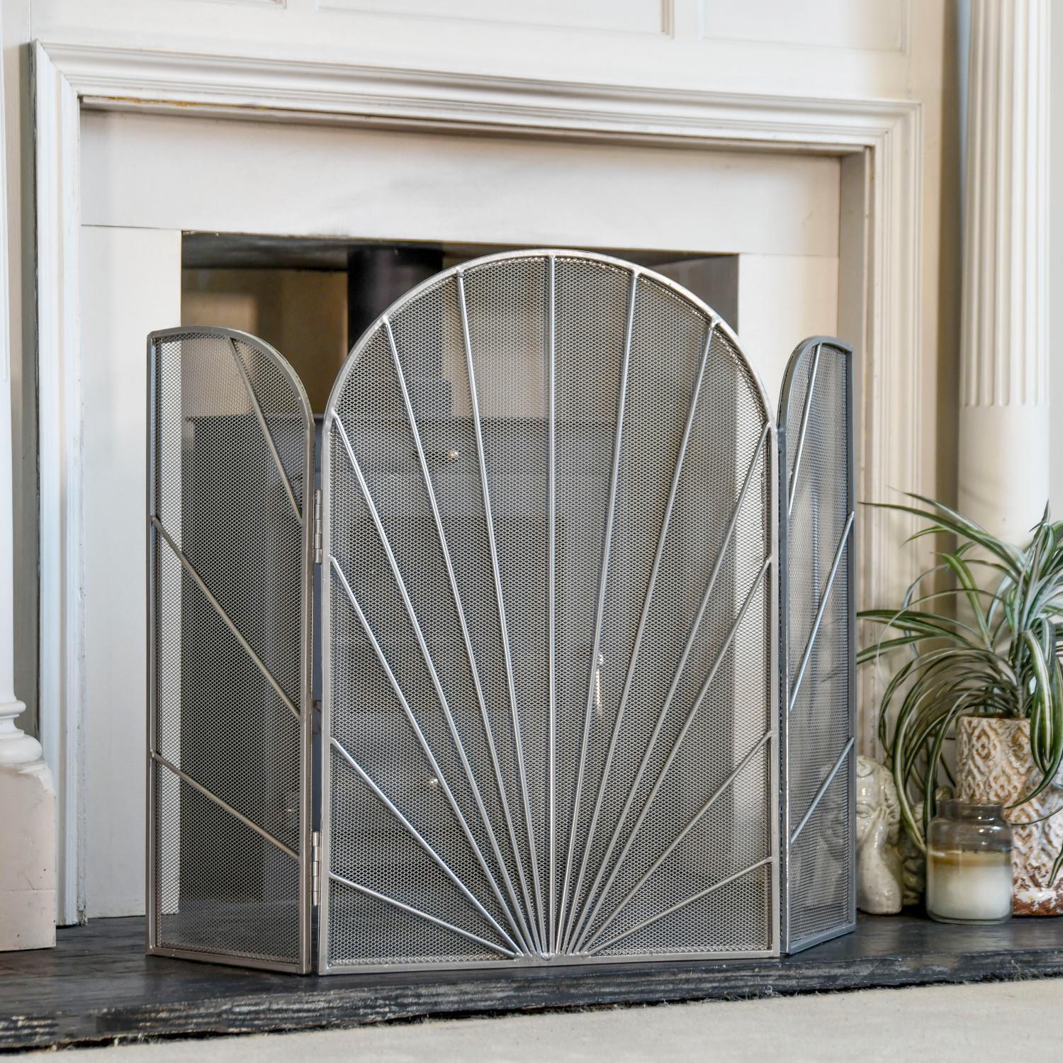 Antique Silver Arched Three Fold Fire Guard Fireplace Spark Cover Protector