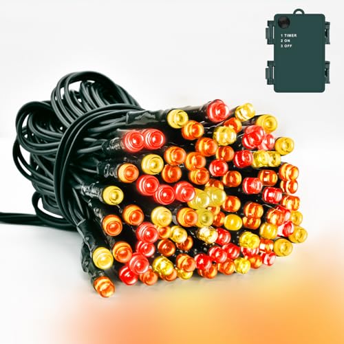 Dalugo Christmas Lights Red Orange Yellow, 5M 50 LED Battery Operated Fireplace Lights with Timer, IP65 Waterproof Indoor Outdoor Battery Fairy Lights for Christmas Decorations(Green Wire)