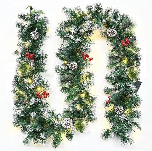 Christmas Garland, 9FT Christmas Garland with Lights Fireplace Garland Christmas Wreath, 2.7M Pre lit Christmas Garland Decoration, 30LED Xmas Garland for Stairs, Mantle, Front Door, Home, Outdoor