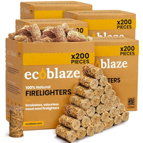 1000 Ecoblaze Natural Firelighters | 5 x 200 Box | Long Burning, Fast Lighting, Odourless wood Wool Starters | Kindling Wood, BBQ Lighter Kit, Firestarter for Pizza Ovens, Log & Wood Burners, Fire Pit