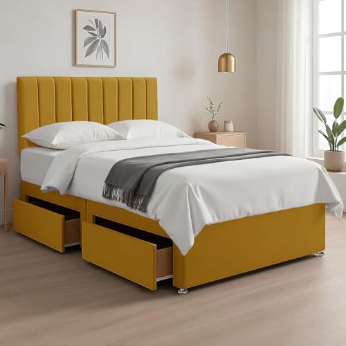 BED TIME UK - Luxe Plush Divan Bed Set | Premium Bed Frame with Spring Memory Foam Mattress & Stylish 20" Vertical Liner Headboard | 2-Drawer Storage (Yellow, 6FT Super King Size Bed)