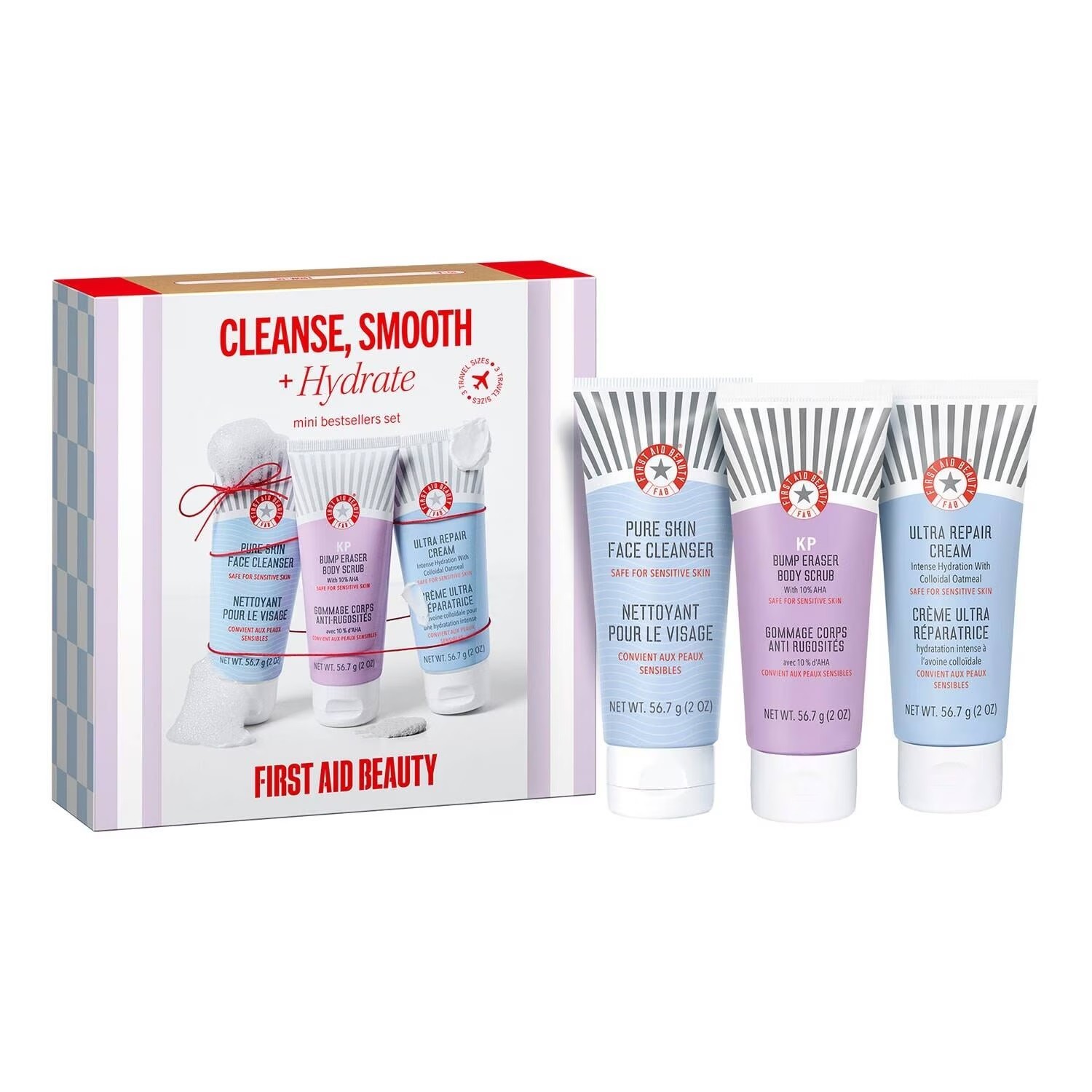 First Aid Beauty Cleanse Smooth + Hydrate Kit - Skin Care Gift Set with Travel Size Facial Cleanser KP Body Scrub & Ultra Repair Cream - Travel Fri