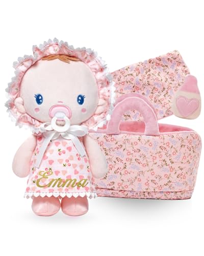 LeyaDoll Soft Baby Doll Set for Toddlers - Personalized Plush Doll Toys with Bassinet, Blanket and Bottle, First Baby Doll Accessories (9'') for Girls Pretend Play and Sleeping Cuddle - Cherry Baby