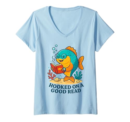 Womens Cute Meme Fish Reading Book Funny Bookworm V-Neck T-Shirt
