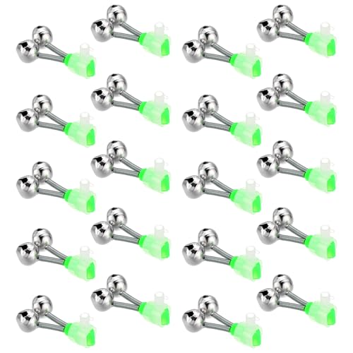 DASBET 20PCS Fish Bite Alarms Fishing Rod Bells for Night Fishing Double Bell Bite Alarms with Clips Reusable Fishing Bite Indicator Clip-On Fishing Rod Alarms for Pole Tips 1.89 Inch Green Fish Bite