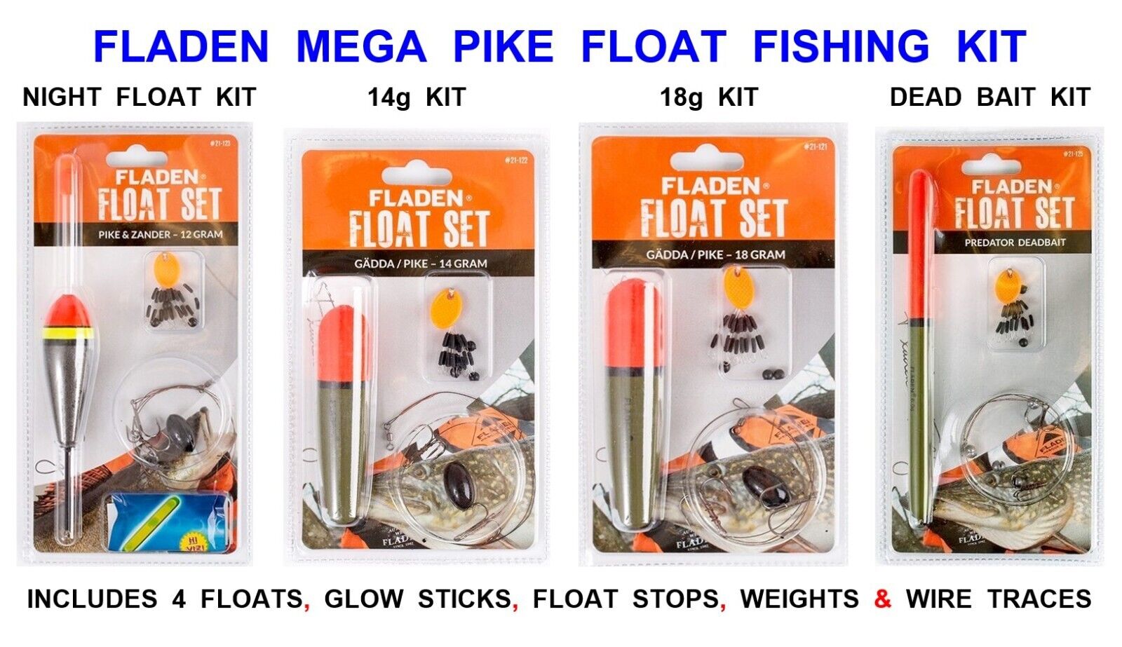 4 FLADEN PIKE FLOAT FISHING KITS FLOATS GLOW STICKS STOPS BEADS WEIGHTS TRACES