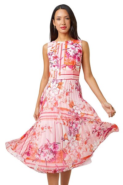 Roman Floral Print Fit And Flare Pleated Dress