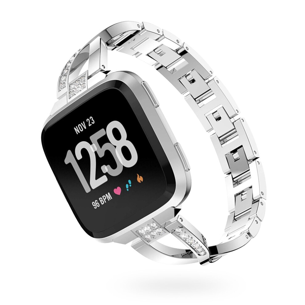 Silver Plated Fitbit Versa Band, One-click Installation & Disassembly Metal Strap with Rhinestones Compatible with Versa 2 Lite Edition SE, Bling