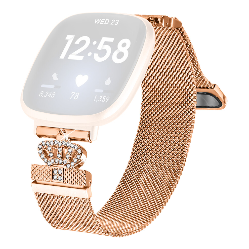 (Rose Gold) For Fitbit Versa 3 / Fitbit Sense Milanese Band Magnetic Crown Clasp Stainless Steel Strap