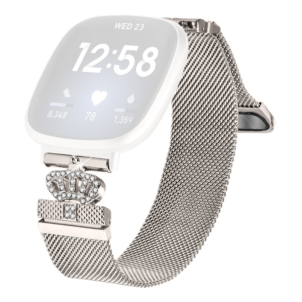 For Fitbit Versa 3 / Fitbit Sense Watch Band Silver Stainless Steel Crown Clasp Milanese Wrist Strap