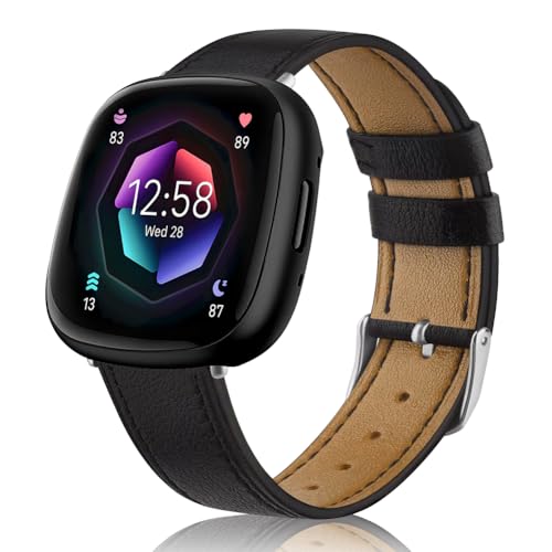 OFFCUP Leather Strap Compatible with Fitbit Versa 3/4/Sense/Sense 2 for Women Men Kids, Genuine Leather Sport Straps Replacement Wristband (Black)