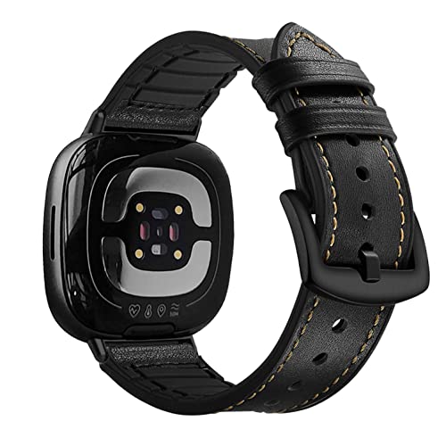 YOOSIDE Leather Watch Strap for Fitbit Versa 4 / Versa 3, Genuine Leather Silicone Hybrid Men Wrist Bands with Stainless Steel Clasp for Fitbit Sense 2 / Sense (Black)
