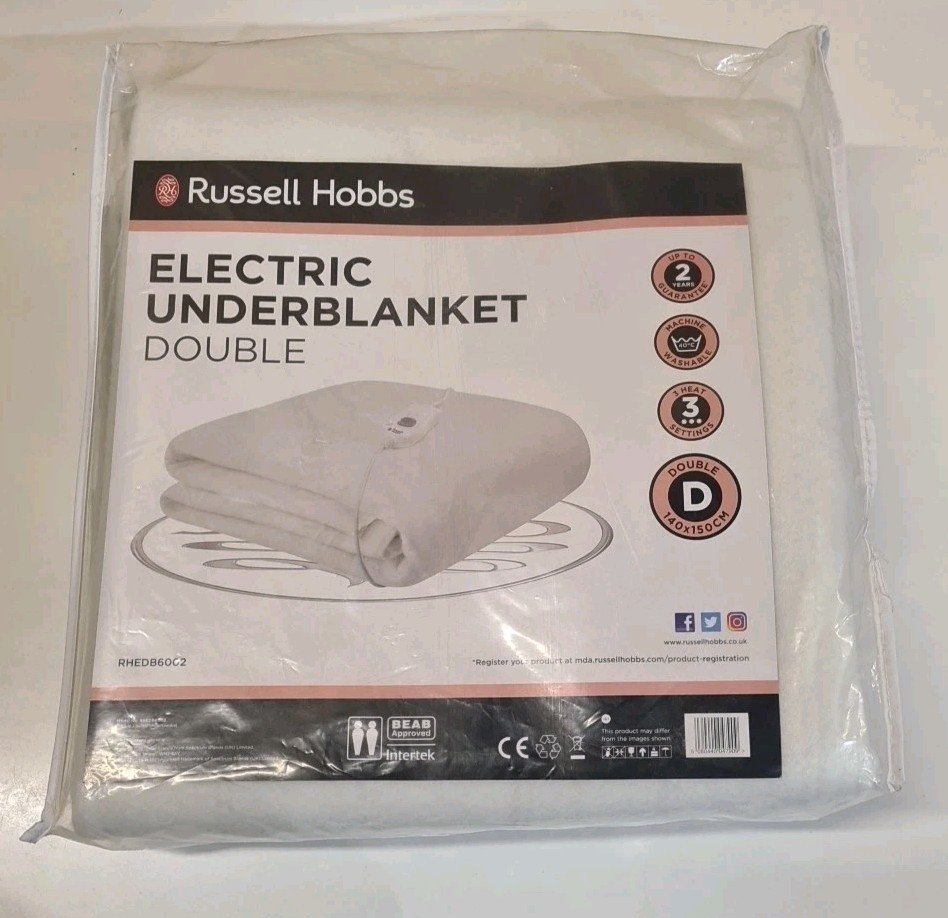 Russell Hobbs Electric Blanket, Heated Double Fitted Underblanket, 3 Heat Settings, Low Energy & Energy Efficient, Machine Washable, 140 X 150 cm, 90W, White, RHEDB6002, 2 Year Guarantee