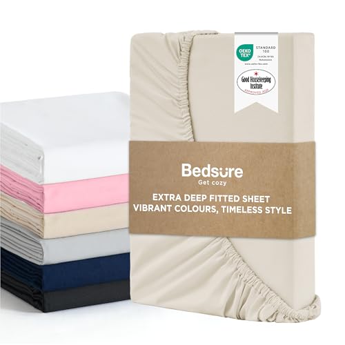 Bedsure Small Double Fitted Sheet Deep - Bed Sheets Extra Deep Pocket 16 Inches (40 cm), Soft Brushed Microfiber for 3/4 Bed, Natural, 122x190cm