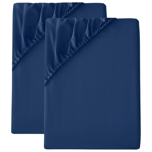 Hixingo King Size Fitted Sheets Extra Deep Pocket, Small Double Satin Fitted Sheet Soft Elegant Solid Color Bed Sheets with 2 x Pillowcases, Shrinkage, Fade Resistant (Navy Blue,120x200x25cm)