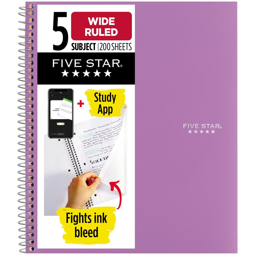 Five Star Spiral Notebook + Study App 5 Subject Wide Ruled Paper Fights Ink Bleed Water Resistant Cover 8"" x 10-1/2"" 200 Sheets Fir