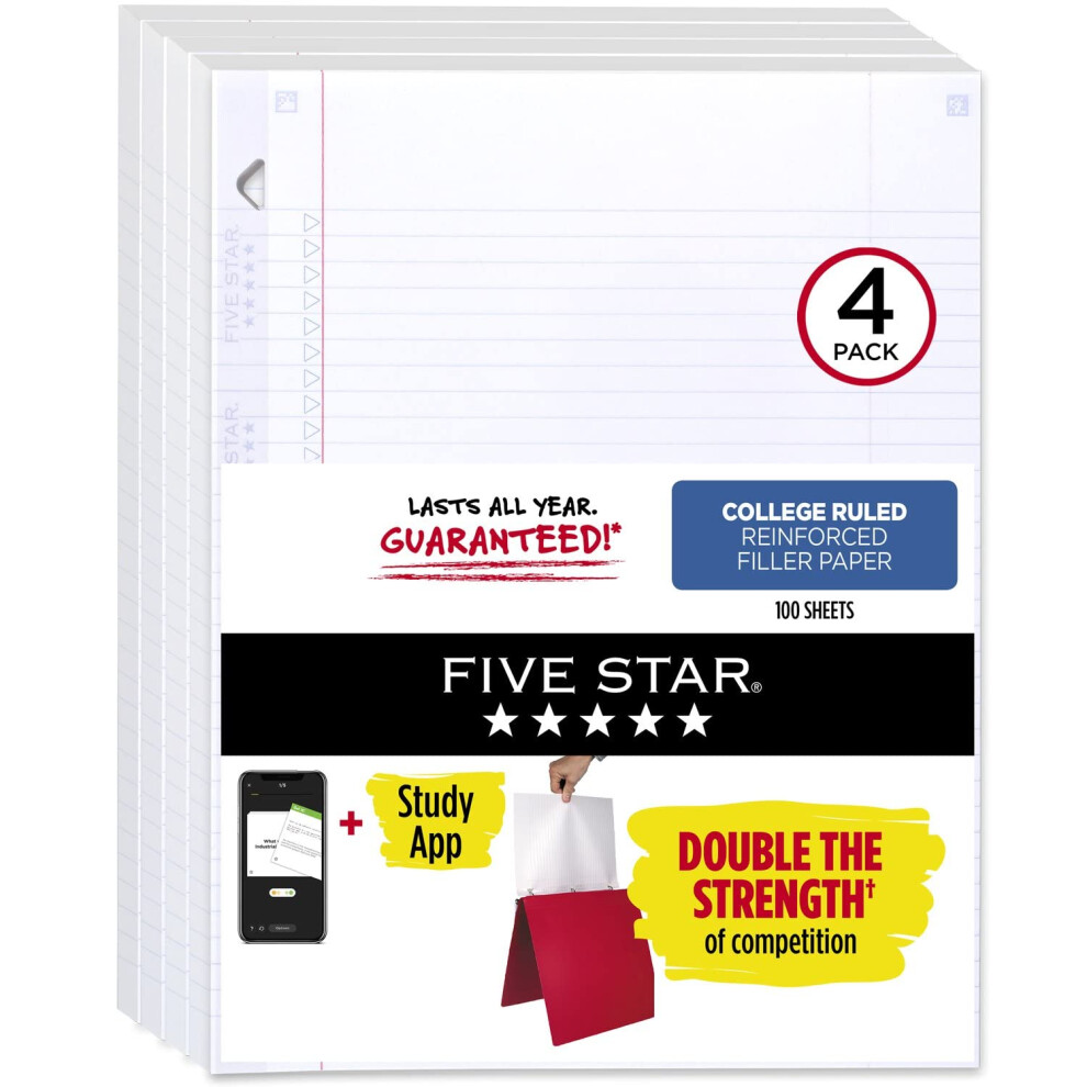 Five Star Loose Leaf Paper + Study App 4 Pack 3 Hole Punched Reinforced Filler Paper College Ruled Paper 11"" x 8-1/2"" 100 Sheets/Pac