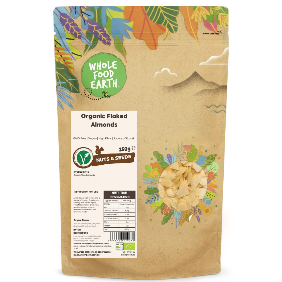 Wholefood Earth Organic Flaked Almonds ? 250g | GMO Free | Vegan | High Fibre | Source of Protein | Certified Organic