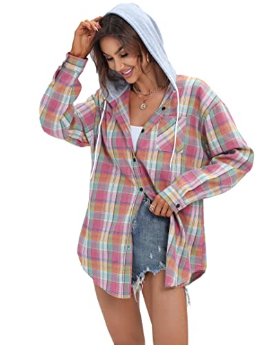 Women's Plaid Oversized Hoodie Flannel Checked Shirts Button Down Long Sleeve Blouse Tops Pink
