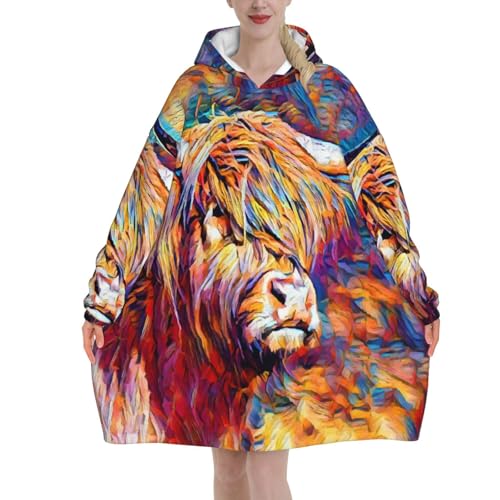 Highland Cow Printed Oversized Women's Wearable Blanket Hoodie, Flannel Pullover Blanket, Blanket Sweatshirt
