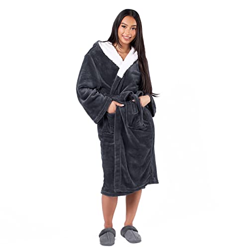 Sienna Long Dressing Gown with Hood for Women Men Ladies Girls Fluffy Sherpa Lined Luxury Super Soft Flannel Fleece Comfy Hoodie Cosy Bathrobe - Charcoal Grey