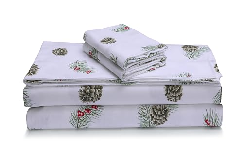 Tribeca Living 100% Cotton King Flannel Bed Sheet Set, Ultra-Soft Portuguese Flannel Sheets, Extra Deep Pocket 4-Piece Bedding Set, 170-GSM Cozy Flannel, Pine Cones and Berries Printed