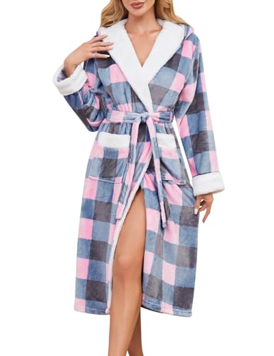 Yuson Girl Women's Flannel Dressing Gown Long Plush Fleece Robe with Hood Warm Winter Bathrobe for Women Soft Fluffy Loungewear Tartan Check Pattern Spa Sleepwear(Plaid-A, M)