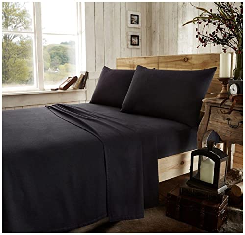 GC GAVENO CAVAILIA Brushed Cotton Bed Sheets, Flannelette Fitted Sheet With Pillowcases, Plain Flat Sheet Double, Black