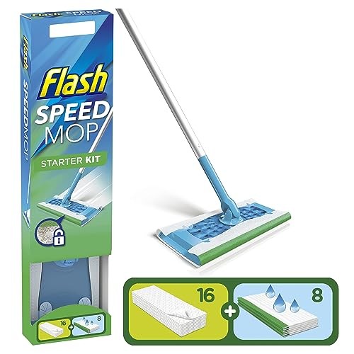 Flash Speedmop Floor Cleaner Starter Kit, Fast Easy and Hygienic (1 Handle, 8 Wet plus 16 Dry Refills), Trap and Lock Daily Dirt, Grease and Grime Without Getting Down On Your Knees