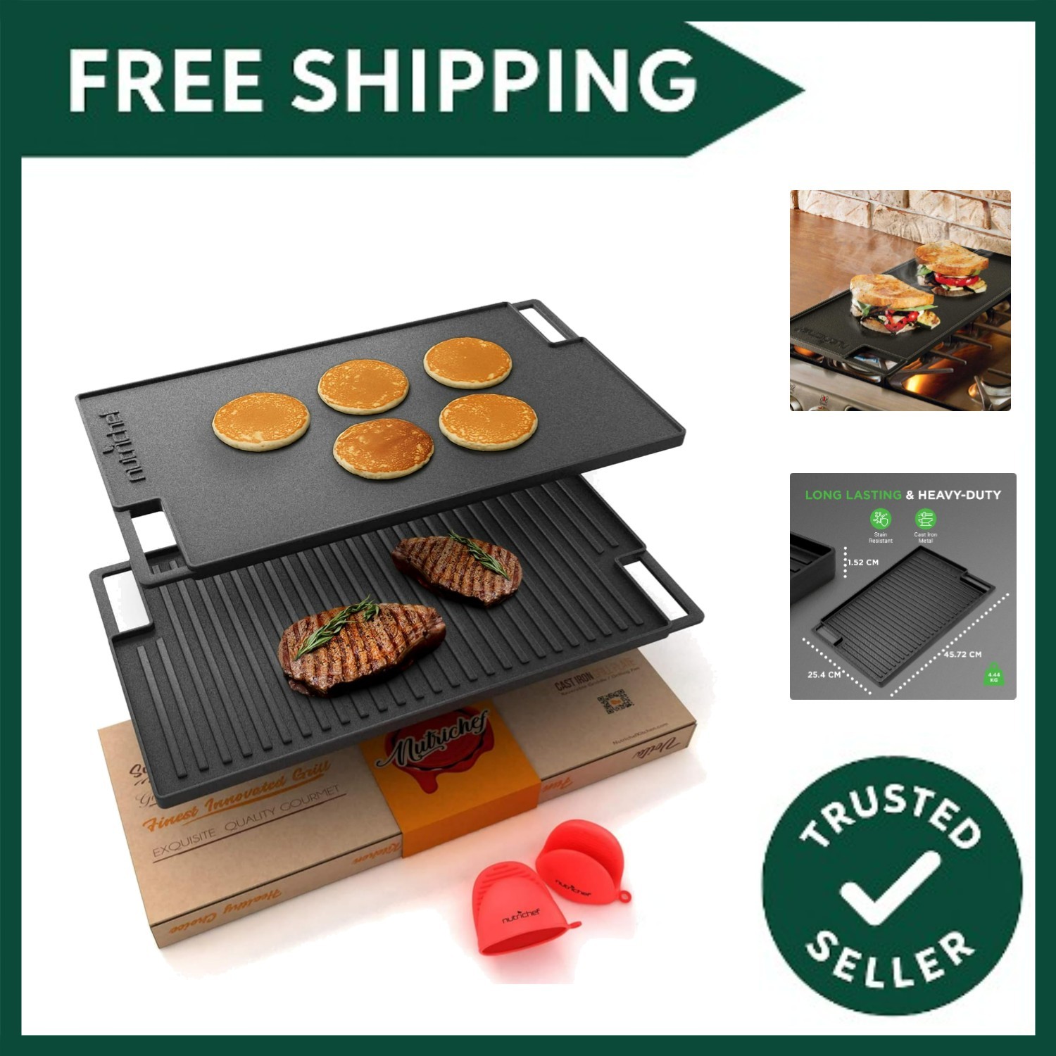 Nutrichef Reversible Cast Iron Grill Plate ? 45.7cm x 25.4cm, Flat & Ridged Griddle Pan for Hob, Oven & BBQ, Induction & Gas Safe, Stain-Resistant &