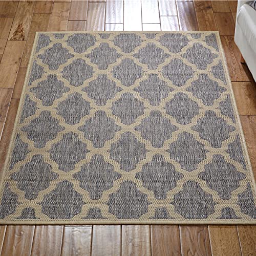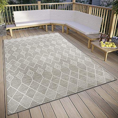 Durable Grey Weather Proof Flatweave Rug Outdoor Washable Non Shed Pet Friendly Patio Lawn Garden Plastic Mould Resistant Floor Carpet Mat Rugs 120cm x 170cm