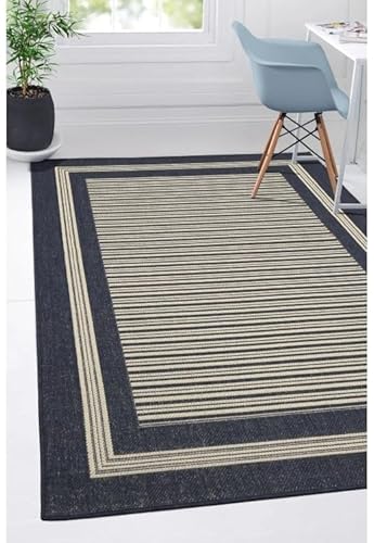 Navy Blue Striped Summer Washable Plastic Flatweave Garden Outdoor Rug Soft Pile Weather Mould Resistant Patio Pergola Decking Mat Area Rugs 120cm x 170cm