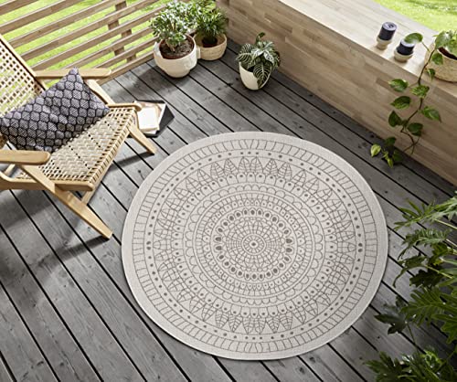 Hanse Home Northrugs Porto Indoor and Outdoor Rug Round Reversible Rug Waterproof Mandala Design Flatweave Rug Weatherproof for Balcony Patio Garden Living Room in Linen Diameter 100 cm