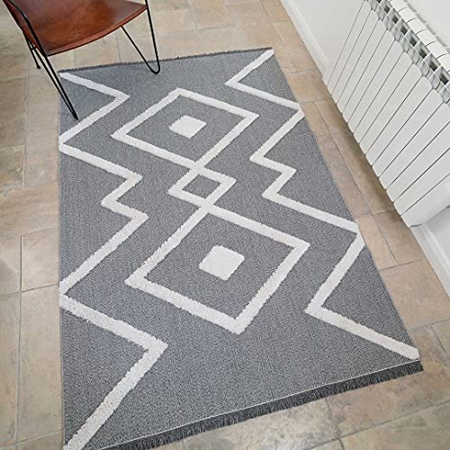 Woven Cotton Flatweave Grey Cream Tufted Hi-Low Pile Carpet Rug Tribal ZigZag Striped Flat-Weave Lounge Living Room Kids Playroom Bedroom Hallway Mat Area Rugs 58cm x 110cm