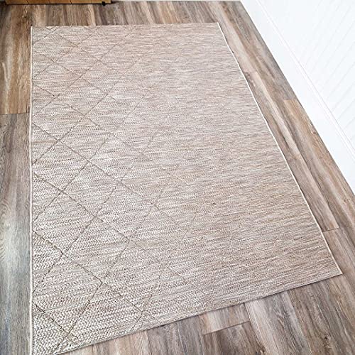 Designer Beige Grey Woven Rug Textured Indoor Outdoor Area Rugs Durable Easy Clean Flatweave Neutral Hallway Dining Living Room Entrance Kitchen Mat 120cm x 170cm