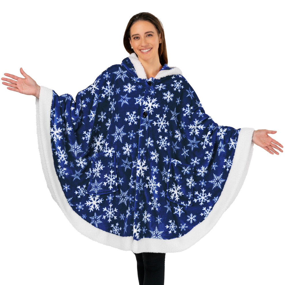 PAVILIA Wearable Blanket for Adult Women, Cozy Plush Fleece Blanket Poncho Cape with Hood, Super Soft Shawl, Angel Wrap Throw for Office, Snowflake Bl