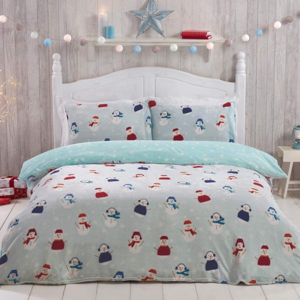 Sleepdown Jolly Snowman Christmas Fleece Blue Warm Cosy Super Soft Easy Care Xmas Grey Stars Reversible Duvet Cover Quilt Bedding Set with Pillowcase