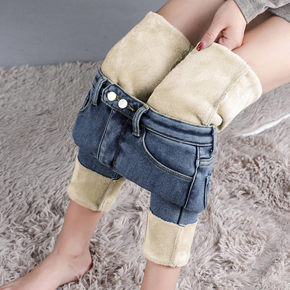 Thermal Fleece Denim Jeggings Women Fleece Lined Jeggings Seamless Faux Jeans Denim Slim Pencil Pants High Waist Slim