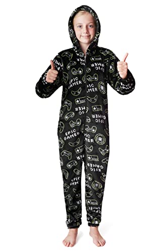 CityComfort Onesies for Boys, Fluffy Fleece Pyjamas for Kids and Teenage Boys Girls, Gaming Onesie, Camo Onesie, Warm Winter Kids PJs 7-14 Years (9-10 Years, Black)
