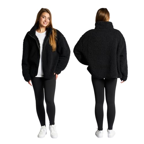 OHS Black Teddy Fleece Jacket Mens, Full Zip Up Coat for Women Men Ultra Soft Cosy Long Sleeve Sweatshirt Casualwear Winter Fleece Jacket for Travel & Hiking, S/M