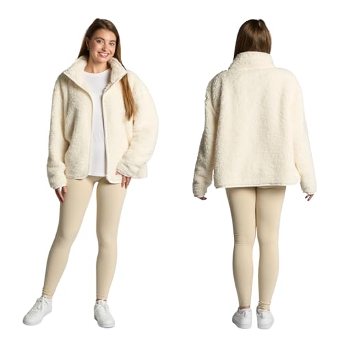 OHS Cream Teddy Fleece Jacket Women, Super Soft Cosy Full Zip Up Sweatshirt Long Sleeve Ladies Fleece Jackets Casualwear Winter Coat for Travel & Hiking, S/M