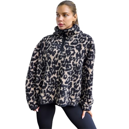 OHS Teddy Fleece Jacket Women, Leopard Print Half Zip Fleece Women Soft Cosy Warm Winter Womens Clothing Ladies Sweatshirt Top Casual Long Sleeve Pullover for Travel Hiking, Natural -L/XL